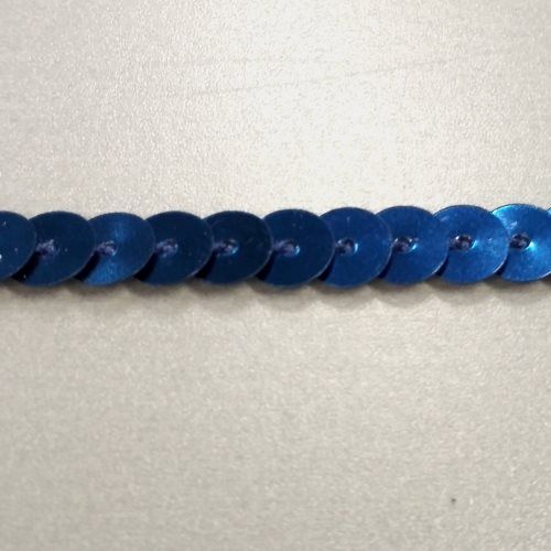 Királykék színű, anyagában színezett flitter. 6mm átmérőjű. Sorban összevarrva.