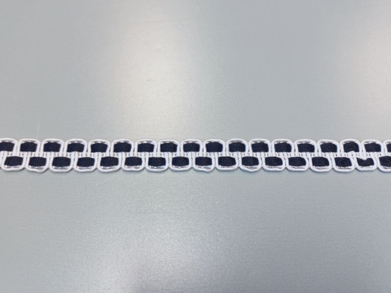 Fekete-fehér színű ruhadíszítő szalag, egy színoldalú.