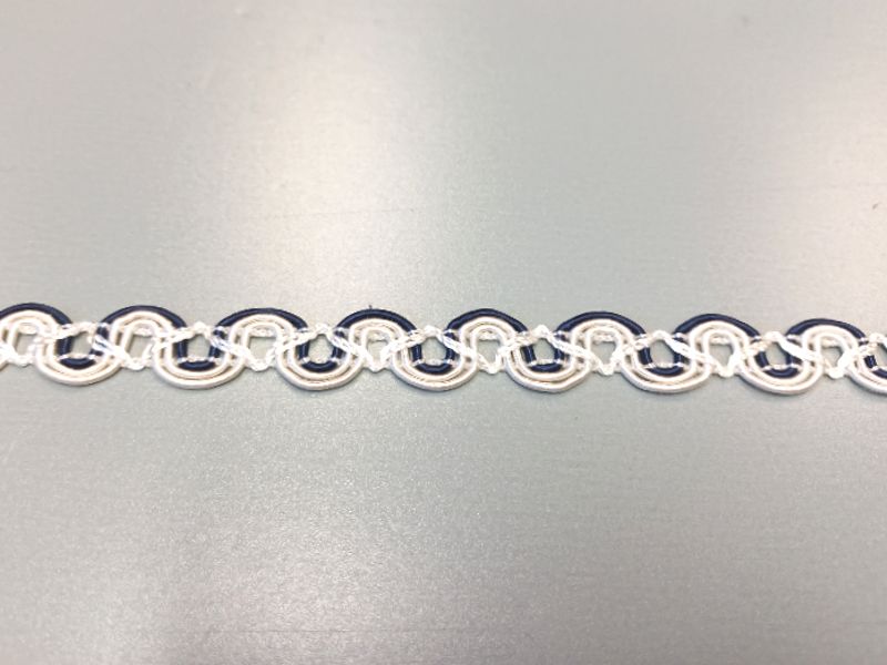 Sötétkék és törtfehér színű ruhadíszítő szalag, egy színoldalú.