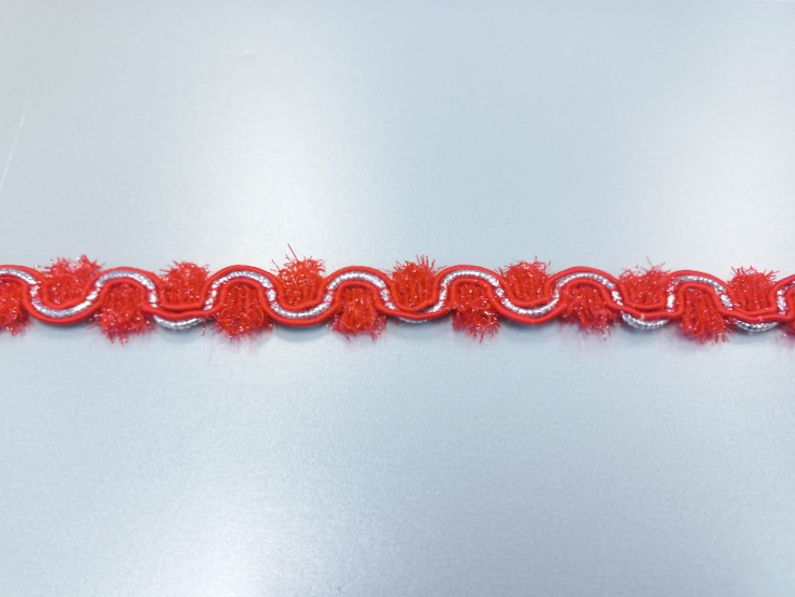 Piros és ezüst színű ruhadíszítő szalag, egy színoldalú.