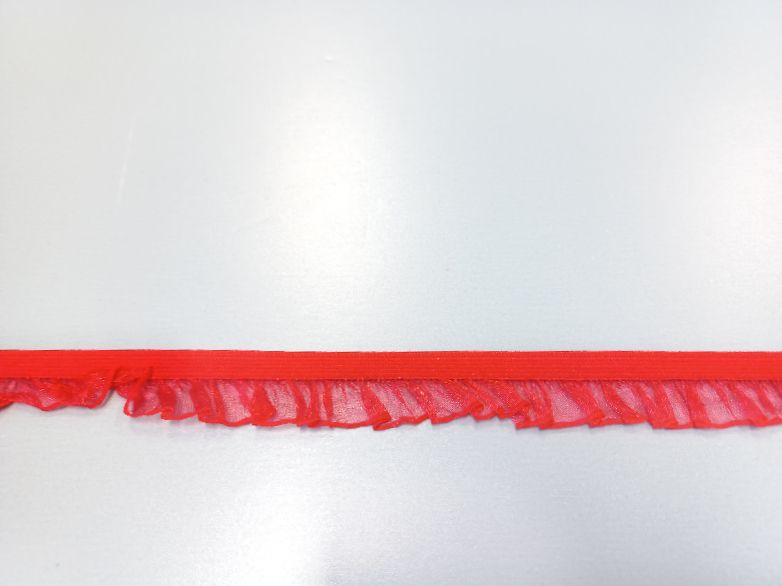 Piros színű organza fodros ruhadíszítő gumiszalag, egy színoldalú.