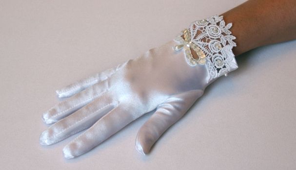 Fehér színű, elasztikus anyagból készült kesztyű, csipke, gyöngy és flitter díszítéssel.