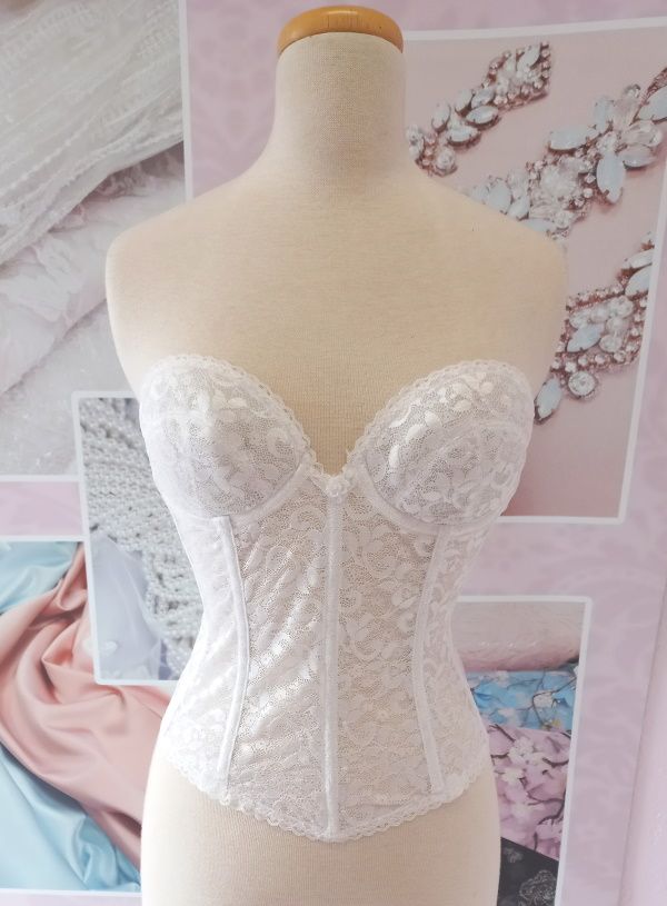 Fehér színű, csipke anyagú menyasszonyi fehérnemű belső merevítőkkel és harisnyatartókkal. Elérhető méretek : 90D, 85D, 80B