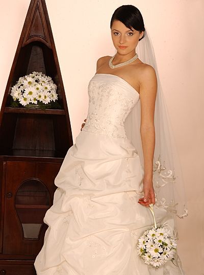 Krém színű, ,,A” vonalú, taft báli ruha, csipke díszítéssel. Két részes. Hátulján zipzáras.