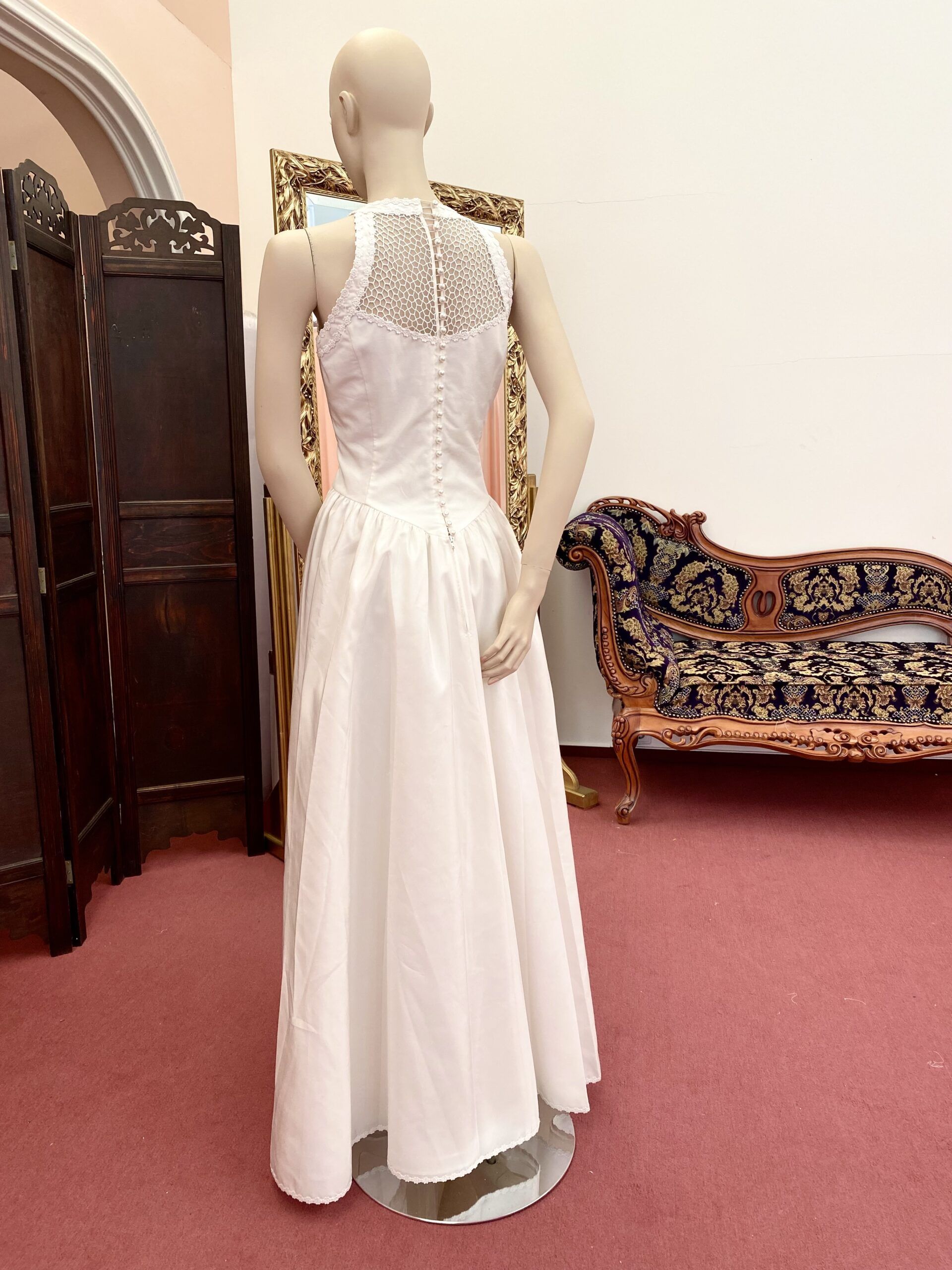 Krém ,,A” vonalú menyasszonyi ruha, felső részén rácsos csipkével és kis virág díszítéssel. Hátulján gombos. Egy részes.