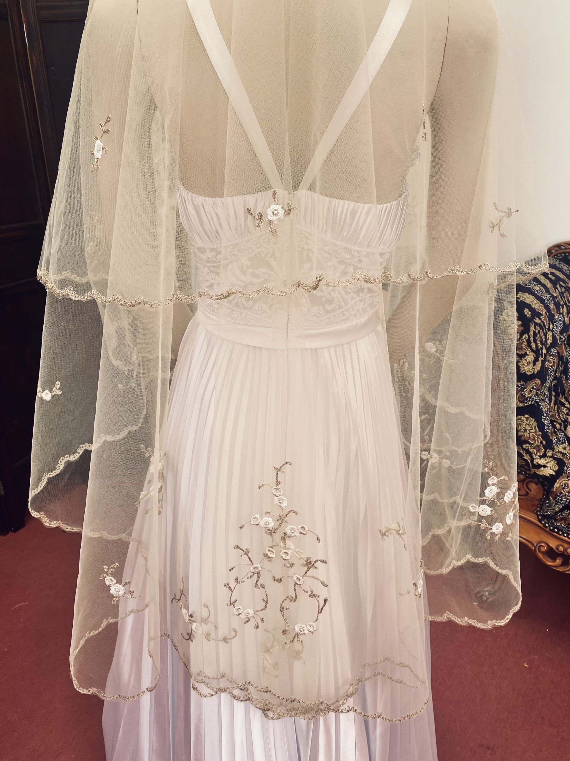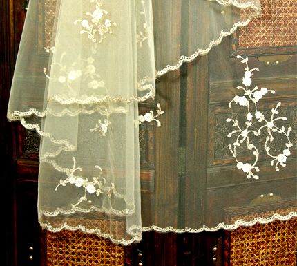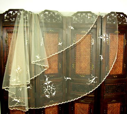 Matt tüllön pezsgő és törtfehér hímzéssel.