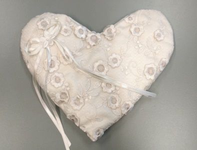 Fehér színű, szív alakú, matt ripsz szatén gyűrűpárna csipke és virág díszítéssel.