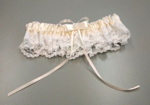 Fehér gumírozott csipke és törtfehér szatén szalaggal és virággal ellátott harisnyakötő.