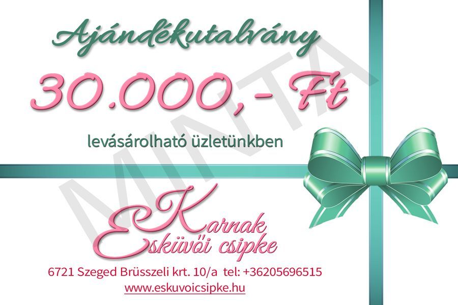 Esküvőicsipke ajándékutalvány 30.000 Ft.értékben. Minden termékünkre felhasználható